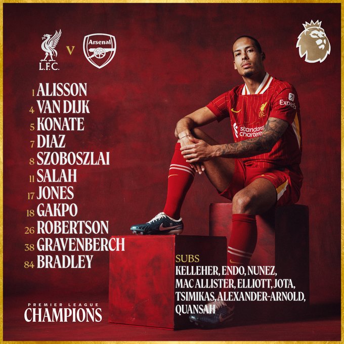Liverpool: Alisson, Conor Bradley (Arnold 67′), Ibrahima Konate, Virgil van Dijk, Andy Robertson, Curtis Jones (Mac Allister 66′), Ryan Gravenberch (Elliott 83′), Mohamed Salah, Dominik Szoboszlai, Cody Gakpo (Nunez 66′), Luis Díaz (Jota 79′).
