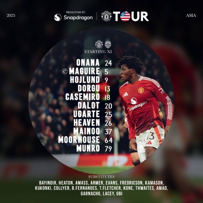 Dù vừa trải qua một mùa bóng rất dài nhưng MU vẫn quyết định tung ra sân đội hình xuất phát khá mạnh trong trận giao hữu với ASEAN All Stars (Các ngôi sao của khu vực Đông Nam Á) với không ít trụ cột của đội 1 như Maguire, Onana, Dorgu, Dalot, Casemiro, Hojlund, Mainoo, Ugarte. Dĩ nhiên trong các trận giao hữu không thể thiếu những gương mặt trẻ: Ayden Heaven – trung vệ sinh năm 2006, Reece Munro – hậu vệ cũng sinh năm 2006 và Jack Moorhouse – tiền vệ sinh năm 2005.