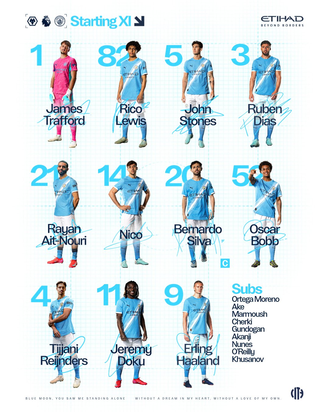 Man City: James Trafford, Rico Lewis (Matheus Nunes 66′), John Stones (Khusanov 82′), Ruben Dias, Rayan Ait-Nouri, Nico Gonzalez, Bernardo Silva (O’Reilly 66′), Oscar Bobb, Tijani Reijnders, Jeremy Doku (Marmoush 66′), Erling Haaland (Cherki 74′).