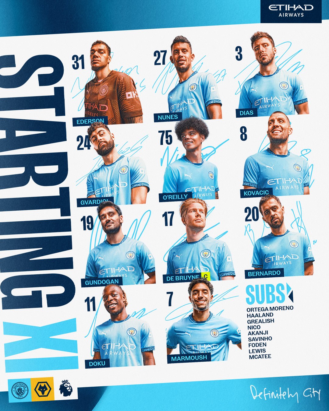 Trước Wolves đang nắm trong tay chuỗi 6 thắng lợi liên tiếp, HLV Guardiola đã có một vài sự điều chỉnh trong danh sách xuất phát so với trận thắng Nottingham. Tiền vệ kỳ cựu Gundogan xuất hiện ở tuyến giữa thay cho Rico Lewis, Kevin De Bruyne cũng được xếp đá chính từ đầu và còn đảm nhận luôn chức vụ thủ quân và cùng Doku hỗ trợ cho Marmoush đá trung phong cắm. Ngoài trên băng ghế dự bị, Erling Haaland đã có mặt sau thời gian dài vắng bóng vì chấn thương.
