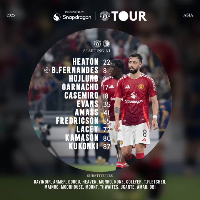 So với trận thua ASEAN All Stars trên đất Malaysia cách đây vài ngày, HLV Amorim gần như thay toàn bộ danh sách xuất phát của MU, chỉ giữ lại mỗi tiền vệ Casemiro và tiền đạo Hojlund. Thủ quân Bruno Fernandes đá chính giữa cơn bão tin đồn sẽ chia tay sân Old Trafford để sang Saudi Arabia khoác áo Al Hilal.