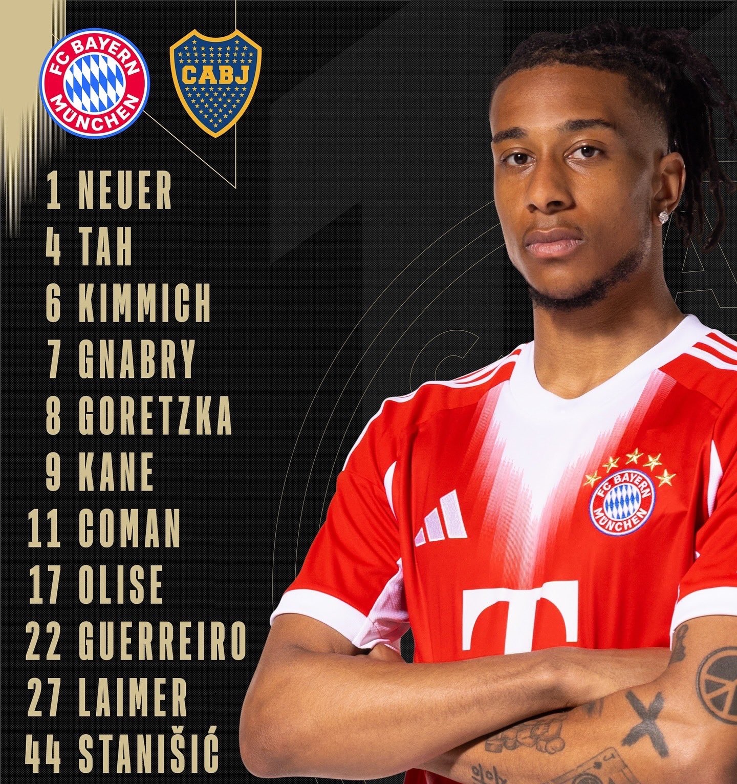 Bayern Munich: Manuel Neuer, Konrad Laimer, Jonathan Tah, Josip Stanisic, Raphael Guerreiro (Upamecano 67′), Joshua Kimmich, Leon Goretzka (Pavlovic 57′), Michael Olise, Serge Gnabry (Musiala 57′, Muller 82′), Kingsley Coman (Sane 67′), Harry Kane.