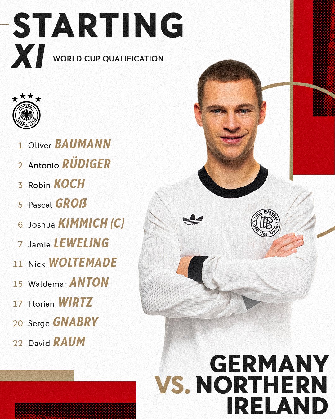 Trước đối thủ như vậy, tuyển Đức đã có một số điều chỉnh trong danh sách xuất phát so với trận thua Slovakia. Một Leon Goretzka (Bayern Munich) dày dạn kinh nghiệm được thay bằng Jamie Leweling (Stuttgart) trẻ trung hơn trên hàng công nhưng ngược lại tại tuyến giữa lão tướng Pascal Gross lại được trao cơ hội bên cạnh thủ quân Kimmich.